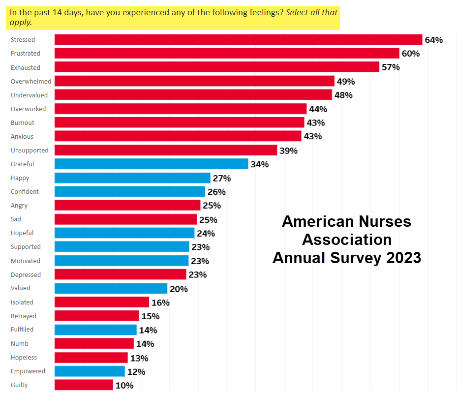 The chart on the right shows what 12,581 nurses told the American Nurses Association in the ANA’s 2023 Annual Survey about how they felt at work. One third or fewer experienced positive emotions. Over 57% had felt exhausted, frustrated, or stressed in the previous 14 days.